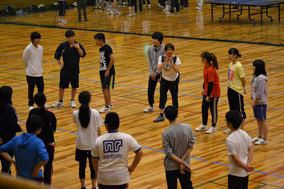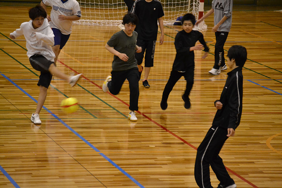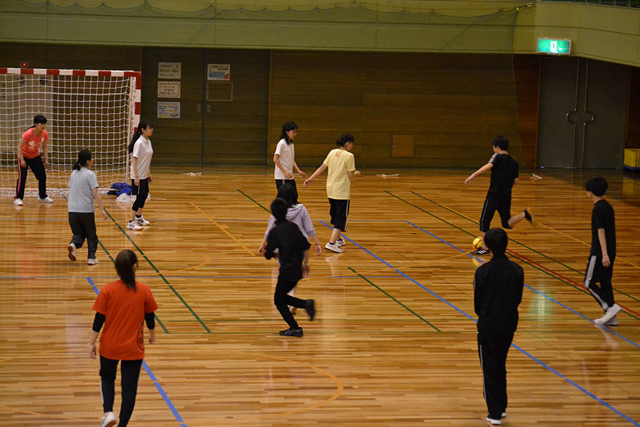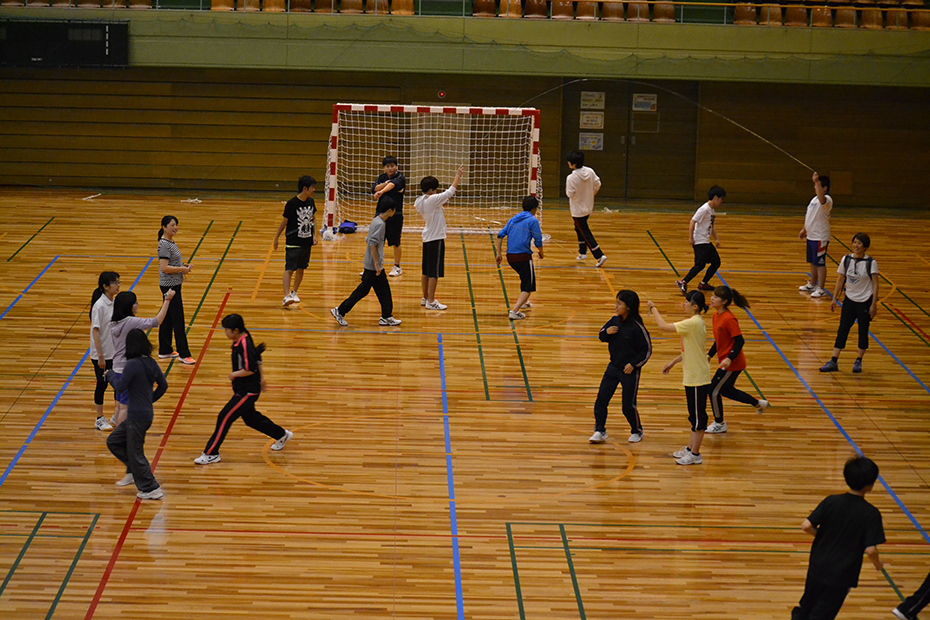 2018年05月16日 ●◯総合体育◯● 夏日となった5月の総合体育は、フットサルを実施しました。今回は、ウォーミングアップの一つとして大縄跳びを取り入れました。始めこそ引っ掛かりが多かったけれど、上達はすさまじい。さらに体育館の熱気が上がりました。ウォーミングアップ後、パス・ドリブル・シュートの練習を行い、休憩をはさんで、男女に分かれて、試合をしました。新1年生にとっては初めてのフットサルでしたが、これも見る間に上達。短時間の試合でしたが、ゴールがいくつかうまれ、チームみんなで大喜び!体を動かすと、頭も心もスッキリ!
