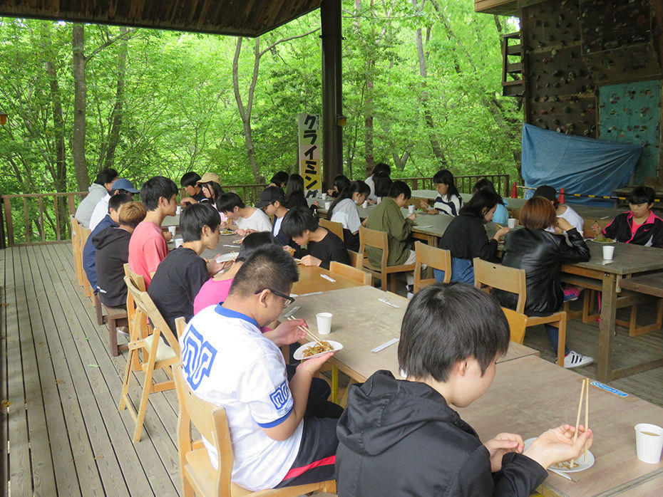 2018年05月01日 ★☆ハイキング&BBQ☆★ 4月27日(金)、JR古虎渓駅から歩いて約40分の山間にある「地球村」でハイキング&BBQを行いました。新緑に包まれ、やさしい木漏れ日の中で調理が始まりました。煙に目をこすりながら、チキンとポークにじっくり火を通し、隣の炭ではソースの音がたまらない焼きそばと、鉄板の回りに並べて焼かれるフランクフルト。「おい、つまみ食いするなヨ」。長い距離を歩いてお腹ペコペコにこの音とにおいは我慢の限界です。できあがったら即完食となりました。添え物のきゅうりの浅漬けはBBQの口をさっぱりさせてくれました。どれも100点でした。